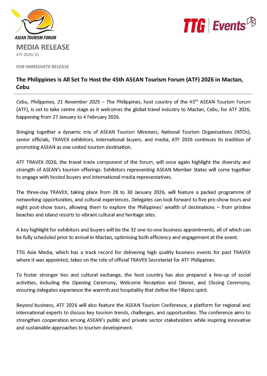 The Philippines Is All Set To Host the 45th ASEAN Tourism Forum (ATF) 2026 in Mactan, Cebu READ MORE December 4, 2025 0 0 News Release